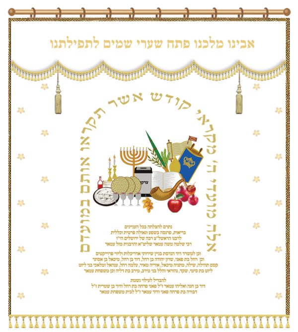 אלמנטים של סמלי חגי מעגל השנה עד לפרטים הקטנים בקומפוזיציה מלאת השראה, עשירה וססגונית במיוחד – המקיפה את הימים הקדושים, תחומים בפסוק גדול ועשיר בצורת חלון , ומשאיר מקום מכובד להקדשה, תחומה משני הצדדים ברקמת פרחים עדינים המוסיפים חן לפרוכת. כפורת צקים בתוספת פסוק ופונפונים גדולים היורדים משני צידי הפסוק. "זה קלי ואנוהו"